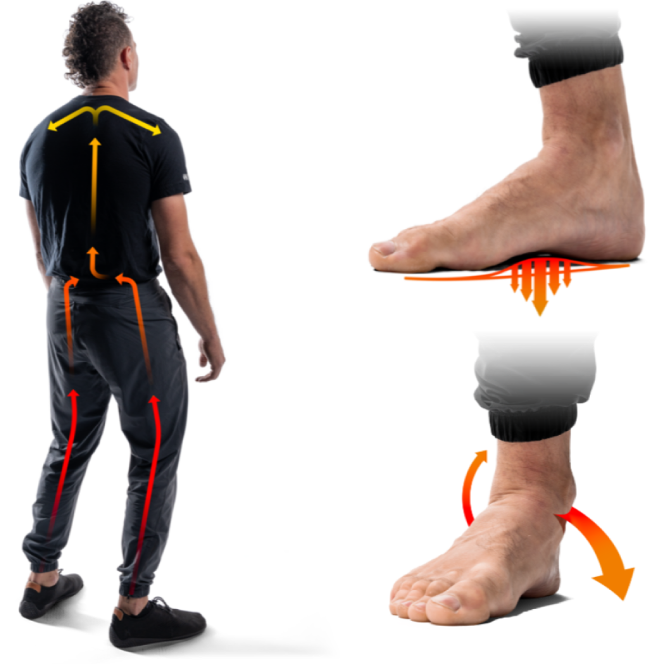 Foot collapse, foot eversion, and fallen arches are caused by repetitive stress and can create problems throughout the entire body. This is often represented in one's poor posture and can be felt in key points on the body (ankles, knees, hips, lower back, upper torso, neck, and shoulders). This not only leads to pain, but can have an effect on your energy and general productivity.